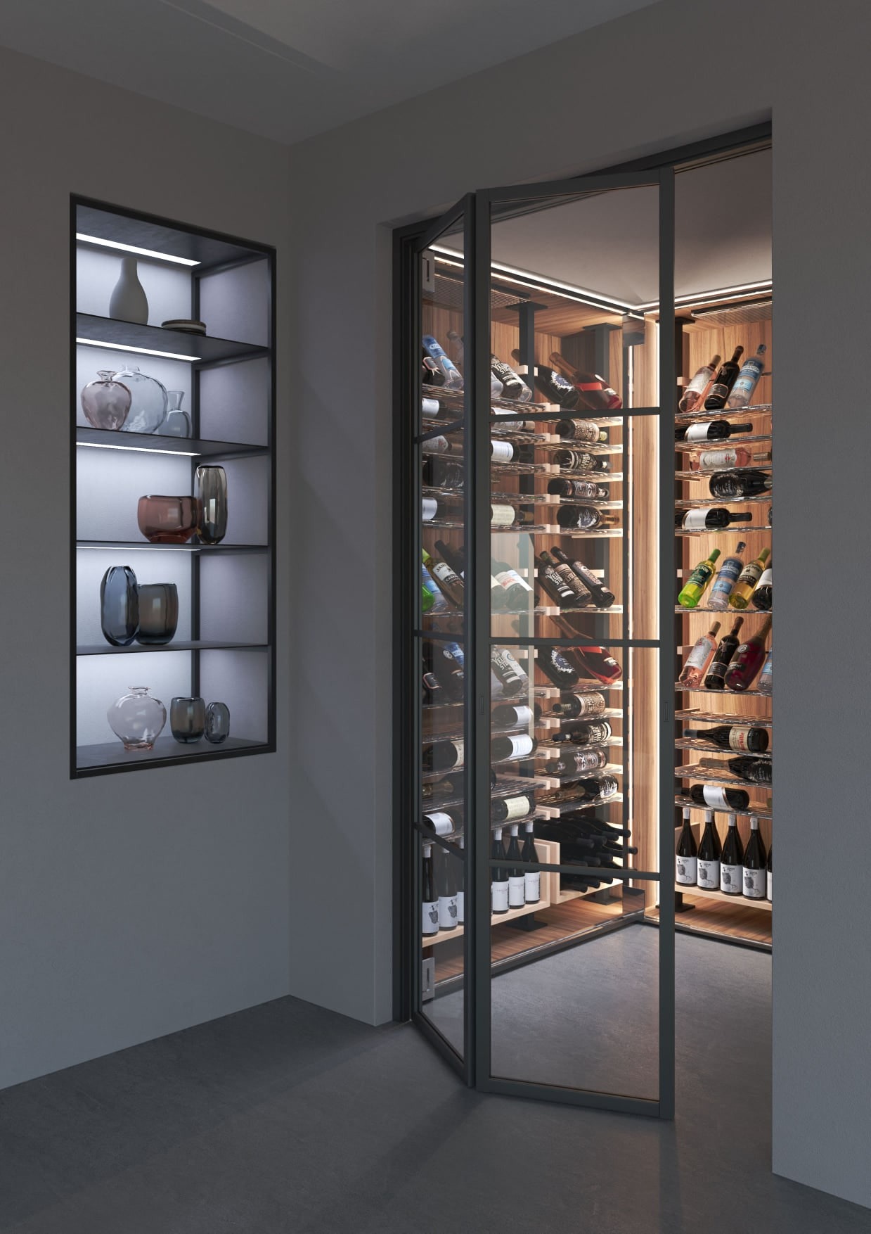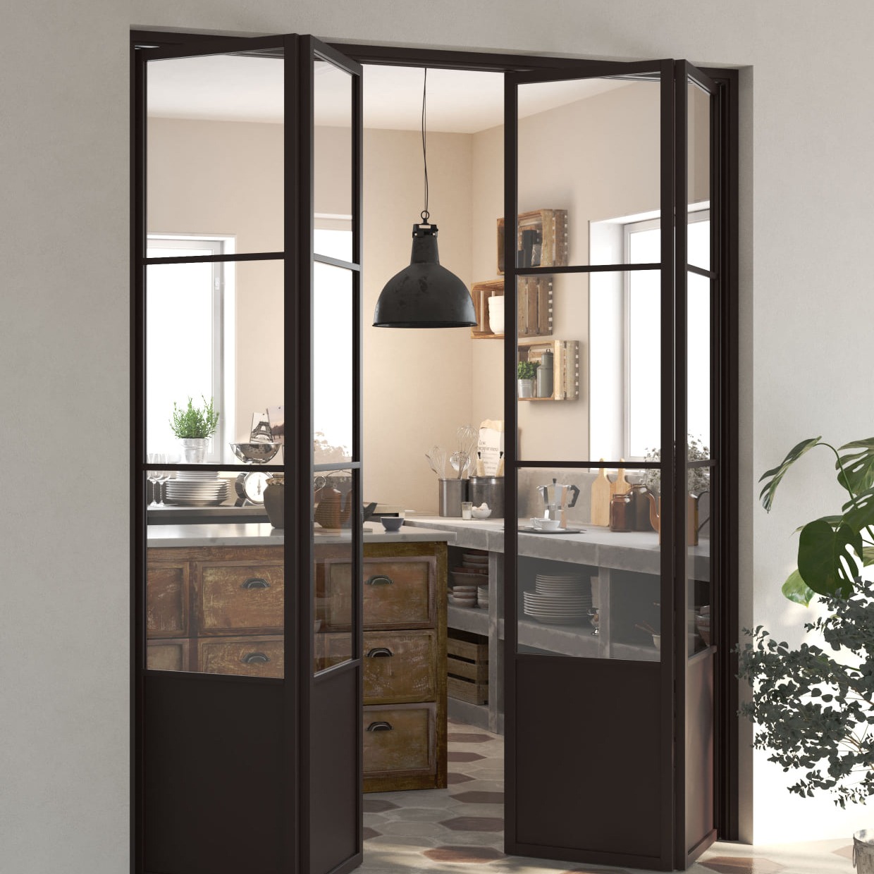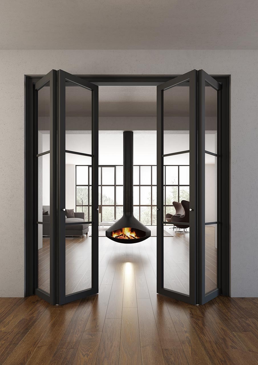Porte a libro disponibili nelle versioni a due o a quattro ante, con vetri stratificati a lastra intera e profili in legno massello