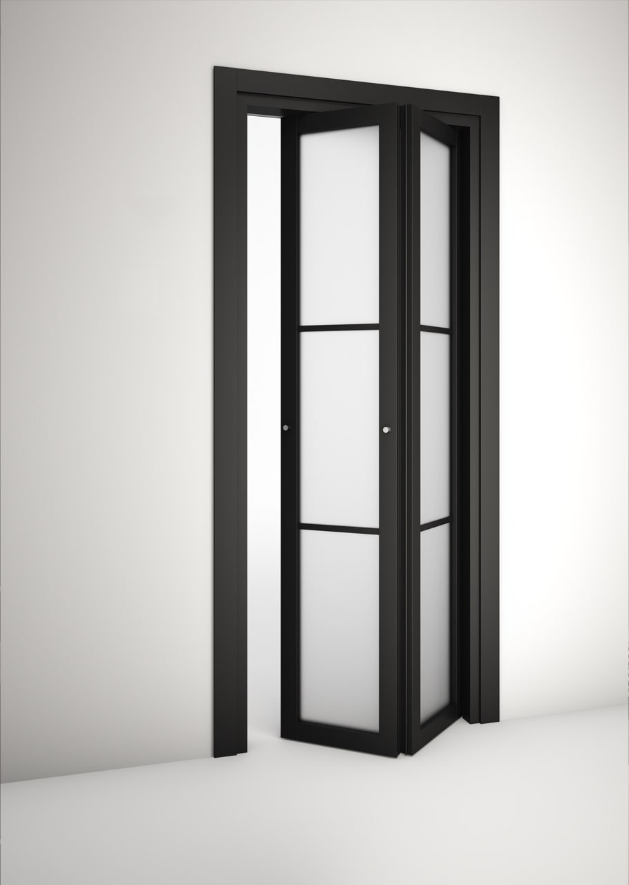Porte a libro disponibili nelle versioni a due, tre e quattro ante, realizzate con telaio in legno e vetro stratificato di spessore 6÷7 mm